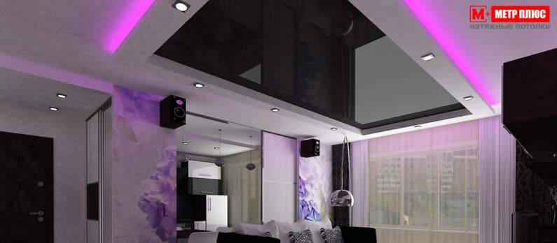 Вот тоже хороший пример. Сплошное чёрное глянцевое полотно натянуто на всё помещение. Зонирование квартиры происходит благодаря декоративной стенке, которая плавно переходит на потолок. Достаточно установить разное по цвету напольное покрытие и установить две люстры для освещения помещения.